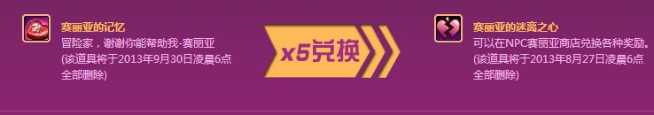 在2013年8月13日-2013年8月27日活动时间内,每天体验迷离大厅地下城,地下城中随机掉落赛丽亚的记忆,推荐地下城中异界,死亡之塔,迷妄之塔,青龙、黄龙等特殊地下城是无效的。