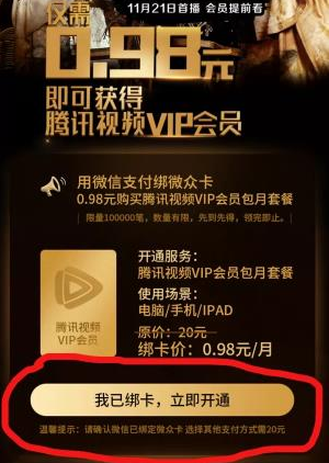 0.98元充值1个月腾讯视频VIP 用微众银行支付即可。