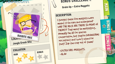 终于打完了死气沉沉的监狱,来到疯狂外科医生3第三关——丛林。3-1的病人是一名探险家(长的一点不像EZ),被一种奇怪的火烧虫感染了,需要尽快救治!本关需要用到一种新道具,就是灭火器,首先电晕虫子,然后灭火,然后再进行常规的处理,连续三次即可电死虫子,接下来正常手术即可过关。三星不难,看看四星需要什么条件才能拿到这颗蓝星。本关蓝星取得条件是再做一次手术,不过需要对付额外的虫子。