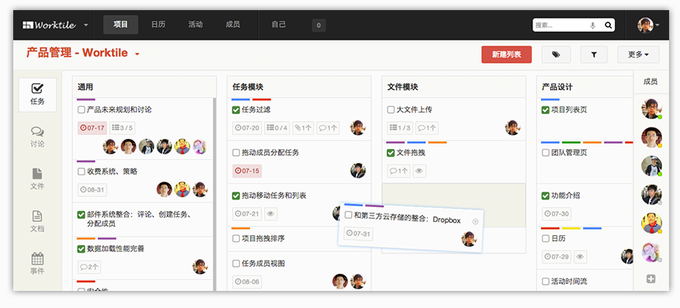具体的做法是:用户进入 Worktile 之后首先得选择或者创建一个团队,然后在特定的团队中创建新的项目。每个项目又由任务、讨论、文件、文档、事件以及邮件等 6 个基本元素互相配合组成。在“任务”中,用户可以像 Trello 中一样,添加任务列表、设置标签和截止时间,以及将任务指派给特定成员。同 Trello 不同的是,在 Worktile 中团队成员也可通过“讨论”功能针对具体任务发起讨论,利用“文件”来完成团队成员之间的资源共享。Worktile 的“文档”功能则是用来帮助团队实现多人实时在线编辑文档功能,为了防止两人或两人以上同时在线编辑同一文档的情况,Worktile 还有简单的锁定机制,保证同时操作的只有一名团队成员。为了方便文档的管理,Worktile 还支持给每个文档添加“子文档”。