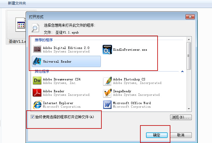 双击打开就可以为其设置默认的打开程序了,如果想以后一直 使用这软件打开epub的话记得勾选“始终使用选择的程序打开这种文件”