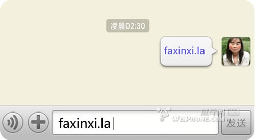 faxinxi.la同时支持Android手机、iPhone、WP……,有微信的智能手机都能使用,大小为0K(无需下载),无广告、无内购,想用的时候在任意聊天对话框输入faxinxi.la即可使用。