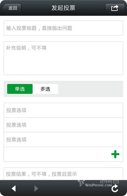 第三步,任意选择你需要的信息类型,这里以选择投票为例。进入发起投票页,就可以根据提示创建你的投票了,发到朋友圈会不会很帅?
