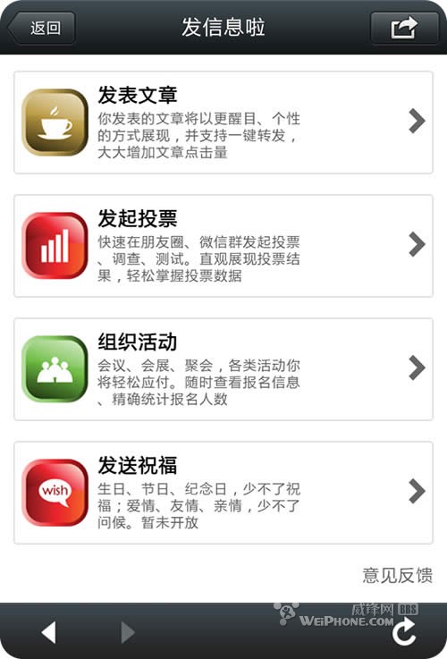 第二步,进入信息发布页面后,我们发现功能真的很强大,这里有很多类型的信息可以发布,原来微信还可以这样?发表文章、发起投票、组织聚会、发送祝福……