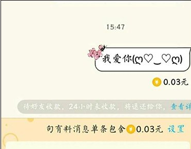 6、当你回到聊天页面的时候,你就会发现你的聊天页面不仅变了一个样子,而且你所发出的消息的右下角就标明了这一句话的金额。