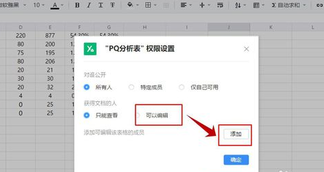 7.点击“确定”后,“成员添加”页面会自动关闭,然后在“权限设置”对话框右下角点击【确定】,这样就可以完成在线表格权限修改的设置了。