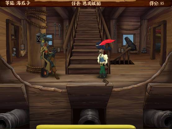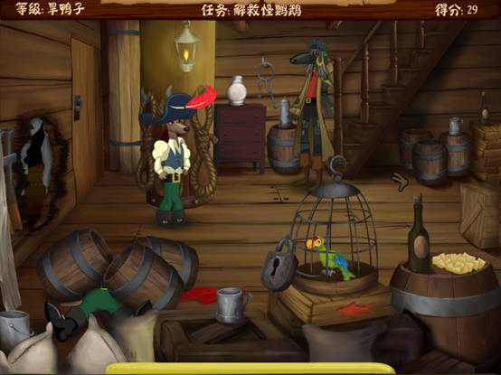 捡起桶下的 红色物体,拿起桶上 脆饼1/30,拿起梅尔文旁边的 钥匙串,打开禁闭室的门回到场景1,拿起油灯和红色物体组合成 抹了油的围巾,用 抹了油的围巾 给鹦鹉笼子的锁上油,然后 钥匙串 打开锁。和鹦鹉对话得到正确答案,(镰刀港,10天禁闭,擦洗甲板,丝绸裙子)梅尔文对话到场景3。