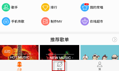 1、打开K米点歌,点击进入右下角【发现】的页面,选择【手机练歌】专区。(如下图)