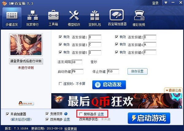 在刷图中DNF百宝箱7.3版本中新增的鼠标连点功能对于新兴职业缔造师的帮助,已是不言而喻。那在城镇中接受任务、获得副职业材料的时候,面对一些啰嗦唠叨的npc要怎么办?鼠标连点功能,同样能有效的设置与记录与npc的对话时的繁杂的鼠标点击过程,接下来你只要找到npc,鼠标连点就将帮你完成接下来的步骤哦!是不是很方便。