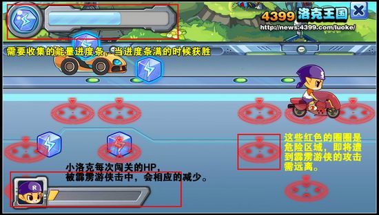这个游戏类似跑车游戏,是使用键盘的方向键操作的,建议小洛克们别走太快,重点是收集能量。