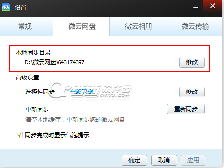 3、微云网盘设置界面中我们可以设置同步的目录,安装完成后会自动新建同步目录,这里我们可以自己新建一个并添加此目录为默认同步目录。