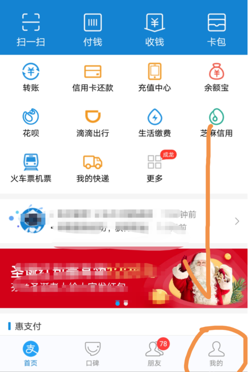 2.进入支付宝界面之后,点箭头指向的我的标志。