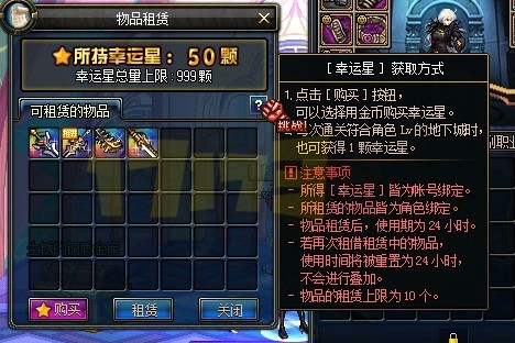 玩家通过购买或通关地下城可以获得dnf幸运星,使用一定数量的幸运星可以兑换武器(从兑换确认起24小时时效,到期后上线即删除)。