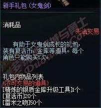 新手女鬼剑礼包属于无法交易的物品,有助于女鬼剑成长。装有复活币、金库等道具。每个角色只能购买一次哦!