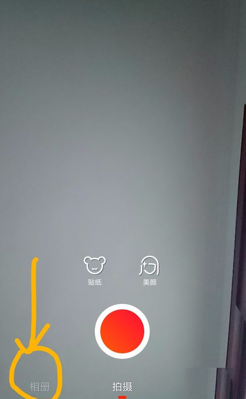 5.点好后,再回到首页,点最下方中间红色“+”号,然后,进入下面的屏幕,点最下方左边的“相册”。有黄色箭头标识。