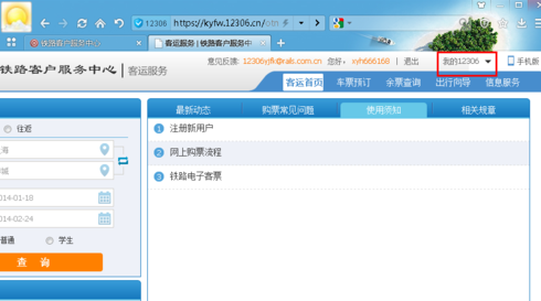 登录12306后,点击右上角的“我的12306”如下图红色方框所示,