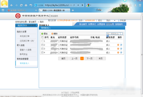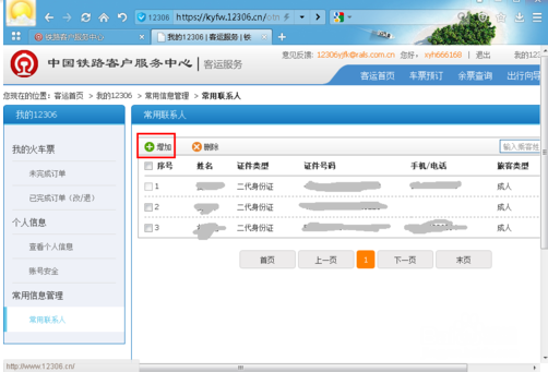 在打开的我的12306页面的左边菜单列表中点击打开最下面的常用信息管理下面的“常用联系人”