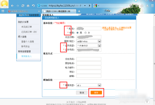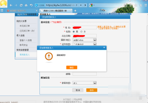 点击“保存”按钮后,系统就会帮我们将我们的联系人信息添加到12306众,添加成功后,会弹出如下图所示的对话框,点击确定按钮关闭对话框