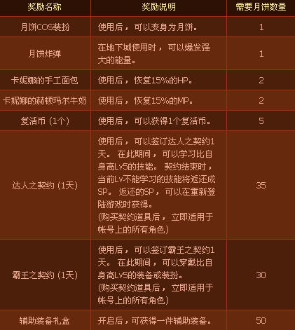 2013 DNF中秋狂欢盛典开启,玩家们每天登陆游戏即可得到月饼,月饼可以兑换月饼COS装扮、月饼炸弹、卡妮娜的手工面包、卡妮娜的赫顿玛尔牛奶、复活币、达人之契约、霸王之契约和辅助装备礼盒等奖励