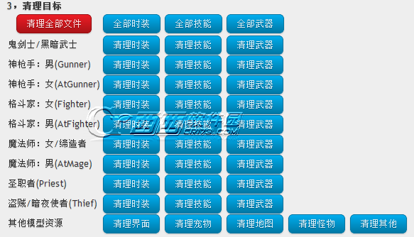 5、如果只需要清理某个角色的npk文件或是游戏其他美化npk文件的话可以选择下面的清理目标进行一键清理。这里要确认要清理的npk文件所属类型,以免清理了不想清理的补丁。