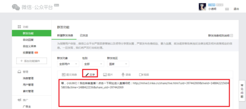 6.广而告之(群发消息),现在群发消息告诉粉丝们你的直播开始啦!要是你的公众号跟小编一样未认证,不能进行上一步,那么可以直接跳到这步,把上面直播间的入口链接群发给粉丝,也是一样的!