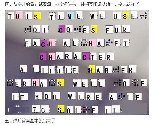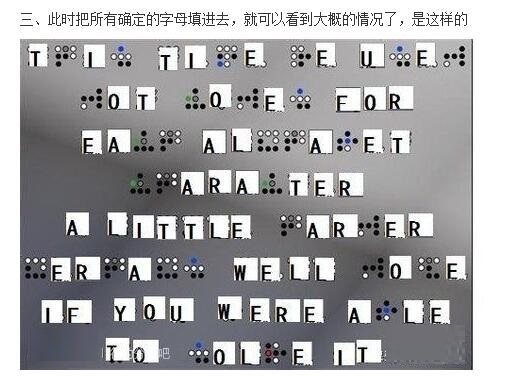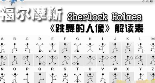 据说是跳舞的人像,即便是看了对造表也表示看不懂好么。根据这么多的游戏以及福尔摩斯搬的探案精神,先找到出现最多的那个确认,已知的是E。另外A元音字母是可以单独成词的。还有字母连用,如EE、FF、LL这些。结果可以得到下图效果。