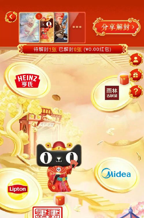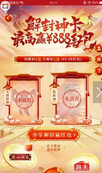 1、复制好友发送的邀请信息或者天猫首页中间的活动按钮就可以跳转到天猫解封神卡的页面;