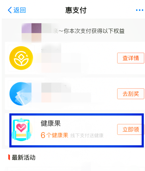 3.我们在线下用支付宝支付的时候,惠支付也会提示有健康果奖励,也可以通过这个进入领取界面,先将其领取,然后点击“立即查看”。