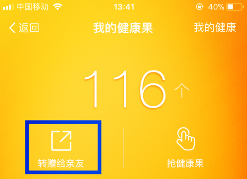 4.在健康果界面可以看到目前累积的健康果数量,点击健康果数量,进入详细界面,左侧有个“转赠给亲友”,点击。