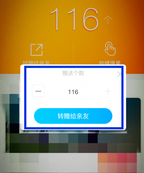 5.系统会弹出赠送数量确认界面,根据个人情况来选择,然后点击“转赠给亲友”,支付宝会访问朋友名单,选择自己要赠送的人。