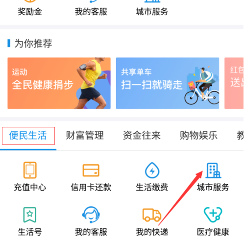 2.在便民生活栏目找到“城市服务”,点击;