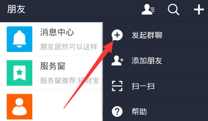 单击+按钮之后会下拉几个选项供我们选择,我们在下拉的选项里单击“发起群聊”按钮。