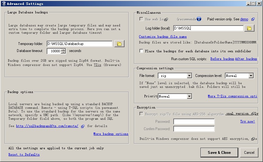 设置备份选项,包括大型数据库临时文件存放路径,压缩备份文件选项,是否校验备份文件,备份数据库日志存放路径,加密备份文件(收费)