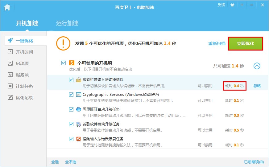 方法一,主页的一键优化功能可以完成瞬间开机优化。方法二,进入电脑加速模块,一键优化功能能根据百度卫士的推荐项自动扫描,若出现优化项,您可以按需求选择优化的项目,然后点击“立即优化”帮助电脑瞬间完成加速。您可以参考每项开机项优化后可加速的时间选择您需要优化的项目。