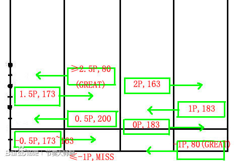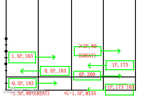 实际上两张图的分数只是相差0.5P而已,你发现了吗?这是因为滑动的时间大致与按键走0.5P的时间相当。如果你滑动的时间很快,则按照第二轮的分数来计算;如果你滑动的时间慢过头了,可能还会爆出GREAT。
