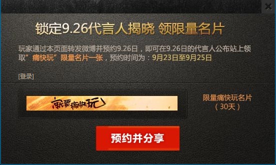 预约方法:登陆游戏账号,在活动页面转发微博并预约,即可在9.26代言人公布站上领取痛快玩限量名片