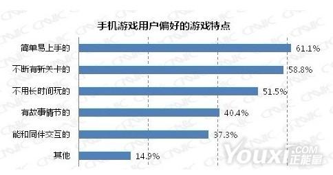 在手机游戏发展方向上,目前 “易上手+多关卡”是手机游戏市场的主要方向。据调查,61.1%的手机游戏用户偏好简单易上手的游戏。简单易上手的游戏使得手机游戏玩家不用花费大量时间学习也可以直接玩,进入门槛较低,容易把握用户。不断有新关卡,是用户偏好的另一游戏特点,有58.8%的用户选择此项。游戏者每完成一个关卡之后会得到金币或分数奖励,并进入到下一个关卡,这些奖励性因素让游戏者不断获得满足感并持续玩下去。此外,与同伴交互,即通过情感元素和社交元素对游戏者进行吸引也是手机游戏的另一发展方向,但手机端游戏因为手机屏幕较小且操作界面来回切换不便、快捷键相对较少等原因,无法像电脑端一样较好实现游戏时和聊天工具的自由切换,直接影响朋友间游戏时的交互,其社交元素与电脑端相比更薄弱一点。目前手机游戏还大多处于游戏后同伴分享和排名阶段。