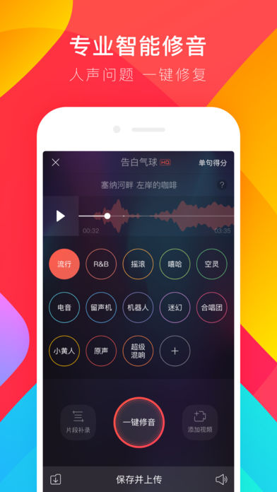 唱吧一键修音是一款唱吧app的最新特色功能,能帮助大家快速一键修音,将各类最新的作品进行声音处理,好比修图一样,让你的声音听起来更加圆润,消除杂音,使大家的作品更加严谨,让更多的人喜欢上你的声音。