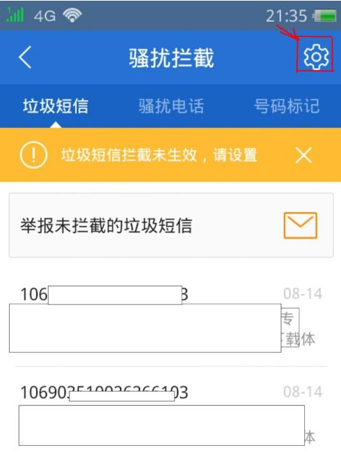 2.我们就在【防护监控】页面点击【骚扰拦截】,进入后点击【设置】按钮。(如下图所示)