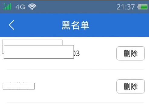 4.添加黑名单后软件会自动跳到黑名单主界面,我们点击界面下面的【黑名单】管理界面,进去后我们可以看到刚刚设置拉黑的用户已在此列。