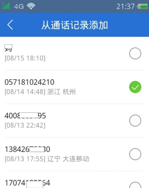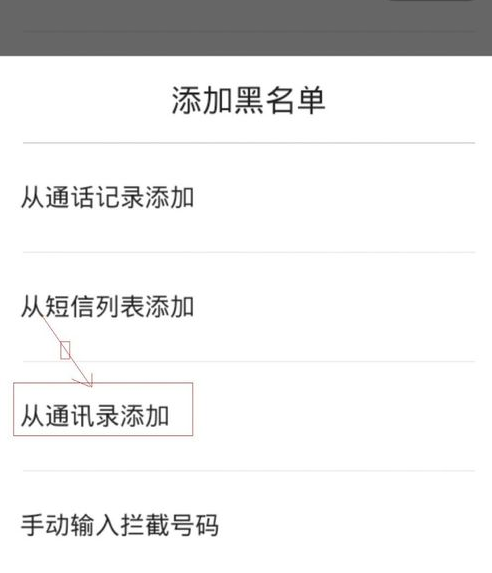 5.【从通话记录添加】黑名单。在【黑名单】界面点击“其他添加方式”,然后点击【从通讯录添加】进入下一步。(如下图所示)