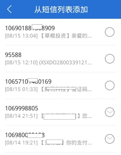 6.【从短信列表添加】黑名单。在黑名单界面点击该选项进入,在弹出的短信列表中选择想要拉黑的短信用户,然后点击【确定】即可。(如下图所示)