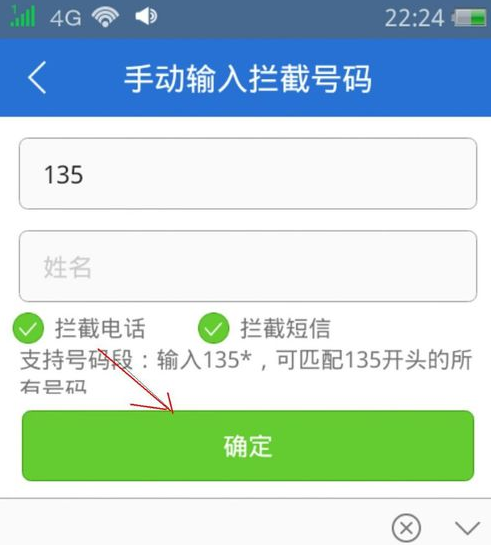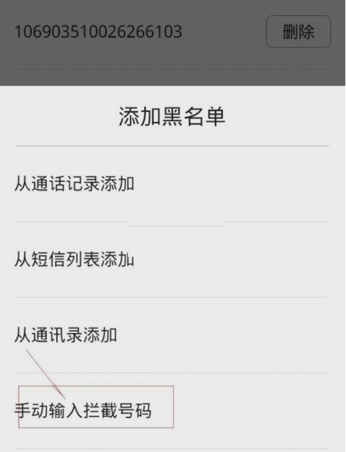 8.【手机输入拦截号码添加】黑名单,在黑名单界面点击该选项进入在弹出的列表中,输入号点击【确定】即可(如下图所示)