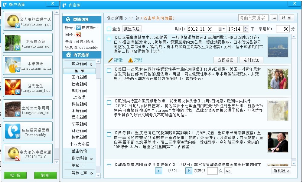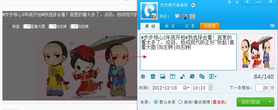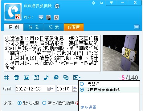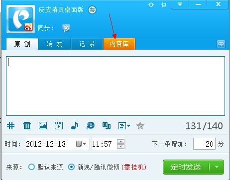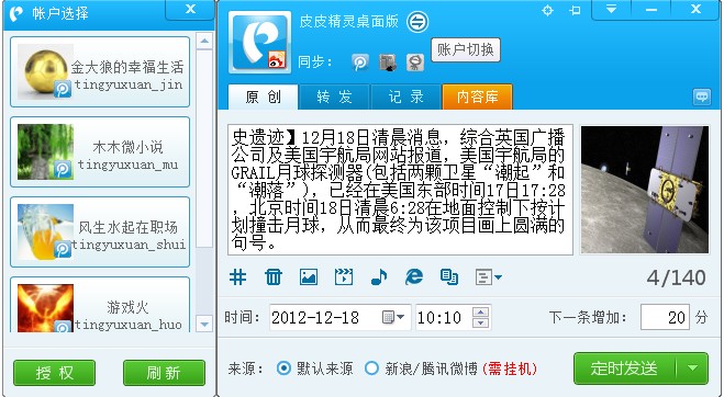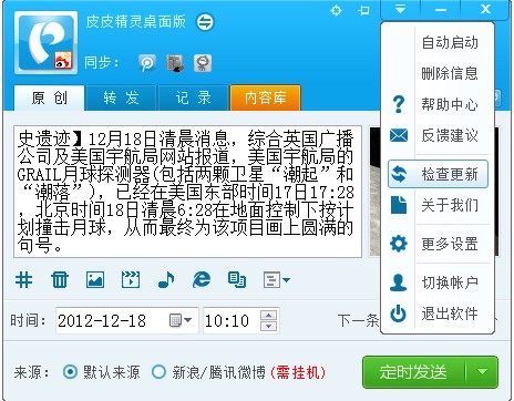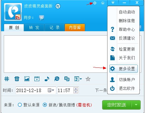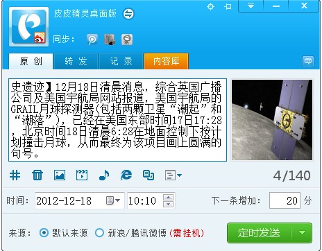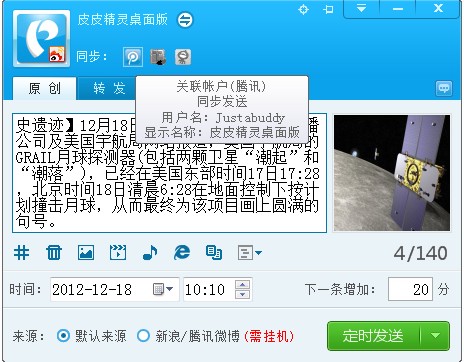 2、官方来源:微博保存在本地电脑,需挂机,到了定时时间由软件在后台发送,显示来自新浪/腾讯微博。