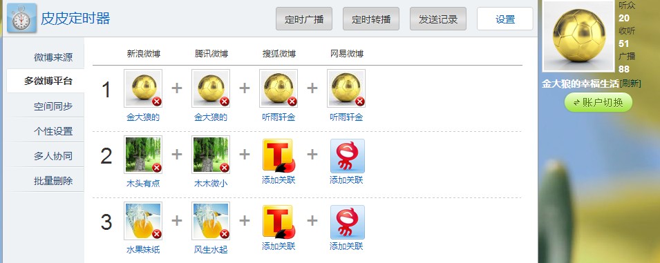 关联多微博平台(新浪、腾讯、搜狐、网易)进入定时器页面,点击设置-多微博平台