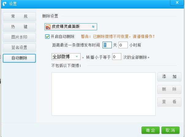 针对各个微博分别删除,开启后,根据时间、分类、转发条数限制选择性的删除,也可添加不想删掉的微博链接
