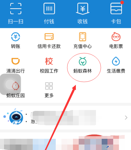 1.打开支付宝软件,在首页,选择蚂蚁森林按钮。