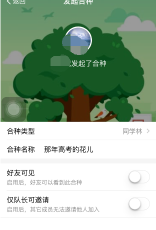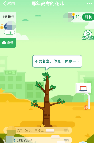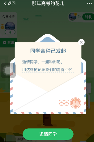 6.在同学林主题界面,会弹出一封信函,同学合种已发起,邀请同学,一起种树吧。用这棵树记录我们的青春回忆,点击邀请同学按钮。