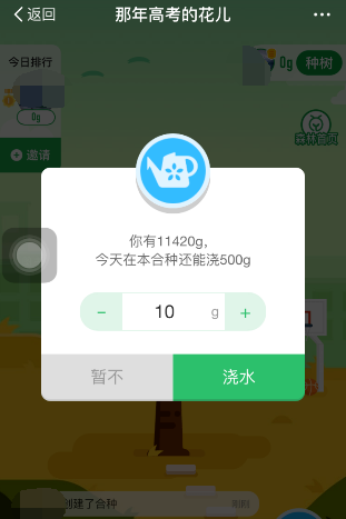 8.返回同学林界面给小树浇点水,点击浇水图标按钮,在弹出你有11420g今天在本合种还能浇500g点击浇水按钮。