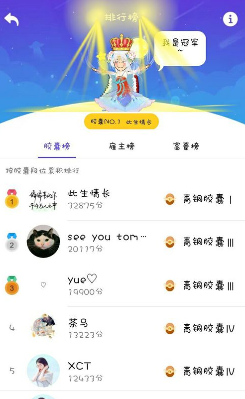 6.在排行榜里我们可以看到三种榜单的排行,胶囊榜、雇主榜以及富豪榜,胶囊榜按胶囊段位累积排行,雇主榜是按一周内抓好友的数量排行,富豪榜则是你一周内厘米石的收入排行,通过排行榜你可以查看自己与好友目前的差距,排行榜的前五名,一周结束后会发放奖励。